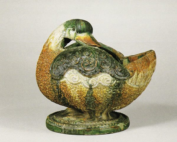 唐三彩は日本人がもっとも好んだ中国陶器の一つである。 そのため、日本には唐三彩の優品が数多く伝世している。 この鴨の器も日本に将来された唐三彩の優品の一つに上げられる作品である。羽根を休めている鴨の姿が生きいきと表現されている。中は空洞とし、尾には八角形の酒杯がとりつけられている。鴨にはまるい台座がつき、円文でかこんでいる。胴の中央で二つに分けてつくった型づくりの作であるが、器体はたっぷりとしており、型物とはおもわれないほど生命力にあふれた力づよい作品に仕上げている。胴の地肌にはボソボソとした、鳥肌状の表現が施され、首の二枚の羽根には唐草文が浮文様で表現されている。器体には緑釉、褐釉、白釉がかけ分けで塗られ、濃い発色をみせている。台座の緑釉 は裏面にまでおよんでいる。内には緑・褐・白の色釉が筋がけにされ、内底は露胎となっている。