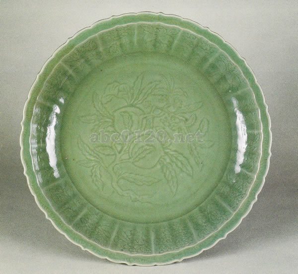 この稜花大盤の器形は元青花に通じ、見込みに折枝文、内側面に吉祥花果文を描く意匠は明代初期の青花盤に見られることから、明代初期の作と考えられる。その釉色は天龍寺青磁と呼ばれるもので、落ち着いた色合いが華やかな彫り文様をよく引き立てている。このような青磁大器は中近東に多く残されており、龍泉窯がイスラム国向けに盛んに生産したと考えられる。出所:中国陶磁器展1992静嘉堂文庫美術館