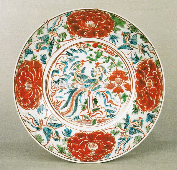 この牡丹盤は赤と緑のほかに、青と黒を使って大輪の牡丹と鳳凰を器面いっぱいに描いた、極めて華やかなものである。赤と黒で大体の形をつけ、緑と者を散らして仕上げている。見込みに描かれた牡丹に双鳳の図は、明代中期からある牡丹孔雀図が源であるが、簡略化と独特のうねるような筆線によって、そうとは気付かぬ程に野放図で精気に満ちあふれたものとなっている。轆轤の跡がわかる粗い作りで、畳付きには多くの砂目がついている。 出所:中国陶磁器展1992静嘉堂文庫美術館