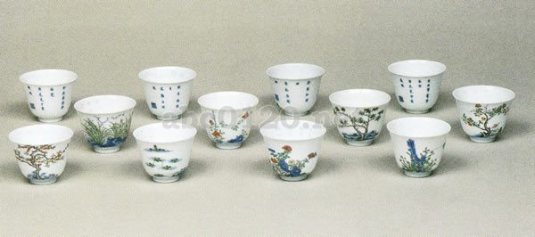 この小さな碗は十二客―組となっている。わずかに端反りになった碗はあくまで薄胎につくられ、重みをまったくといってよいほど感じさせない。それぞれの碗には花木の図と五言詩が対となって描かれている。花木の意匠は春夏秋冬の季節をあらわす図が描かれ、詩文もそれぞれの季節にあう詩が選ばれている。 こうした十ニ客一組の碗は康煕年間の景徳鎮官窯の中で宮廷用の什器としてさかんにつくられたものであろう。静嘉堂には幸い、十二カ月がそろって残っており、良好な状態で保管されている。高台内には「大清康煕年製」の銘が青花の楷書体できっちりと記されている。おそらく酒杯の具として喜ばれたものであろう。出所:中国陶磁器展1992静嘉堂文庫美術館