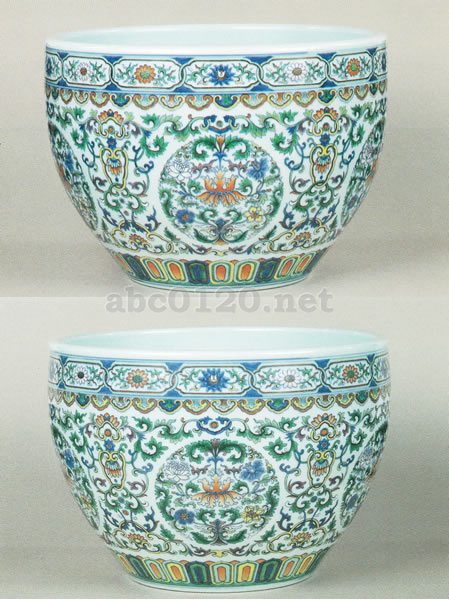 この厚手の大きな深鉢はその器形からも示されるように植木鉢の一種であり、かつては宮廷の庭を飾ったものなのであろう。やや青みをおびた精密な白白磁胎の上には緻密な文様がぎっしりと描き込まれている。口辺には短冊形の中に宝相華文を描いた単位文様をつなぎあわせた帯文様をめぐらせ、胴には大きな団花文を四つ配している。団花文は牡丹の花をシンメトリックに描き、紅彩、緑彩、黄彩、青花で彩色を加えている。団花文のまわりは宝相帯唐草文で埋めている。裾は蓮弁文で囲んでいる。いわゆる型物の作品で日本には類品がいくつか知られている。底裏に「大清乾隆年製」の銘が記されている。