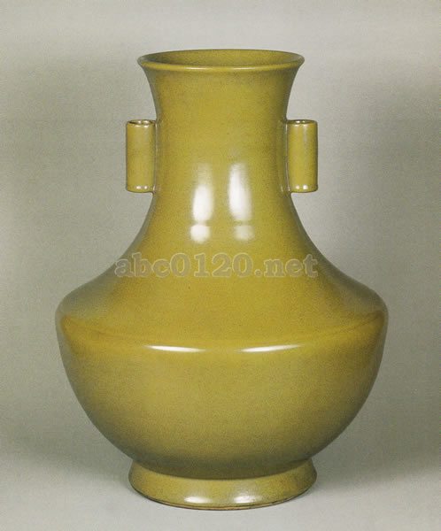 茶葉末釉は日本では蕎麦釉ともよばれる鉄釉の一種で、鉄の微粒子が釉表で濃い黄緑ないし灰緑色を呈したものである。雍正、乾隆年間の景徳鎮官窯ですぐれた製品が焼造された。茶葉末にはしばしば大作がみられ、 この管耳瓶のように銅器の器形に倣ったものが多い。しかし、銅器を原型としながらも複雑な文様は全くなく、また器形も単純化され、清代景徳鎮官窯らしいれ洗練された作風に仕上げられている。美しい釉面の広がりが見所となっているのである。茶葉末釉は畳付を除いて全面にかけられ、底裏中央だけ四角に釉をとり、「大清乾隆年型」の篆書三行銘があらわされている。出所:中国陶磁器展1992静嘉堂文庫美術館