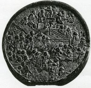 程君房、方于魯二氏に始まるが多くの類似墨がある。円形墨で径一五センチのものが最も大きく、 一ニー一〇センチぐらいのものまである。幕題も篆書、楷書、縦書、横書とある。童子の遊戯図で図柄は二種に分かれる。裏の童戯図に獅子のいるものといないものとある。出所:『文房古玩事典』宇野雪村 関連用語: