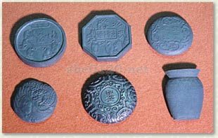 前者と似た型式であるが、龍の図に違いがあり、幕題に「玄龍像」とある。幕題のかおりにと汪伯玉の銘を入れている墨がある。大きさにも差があり、万暦時代の諸家で作ったようだ。『方氏墨譜』が原形だろう。この型を踏襲しながら、「四霊」とした墨もある。後世の仿造墨に扁平円形の「玄龍煥」がある。出所:『文房古玩事典』宇野雪村