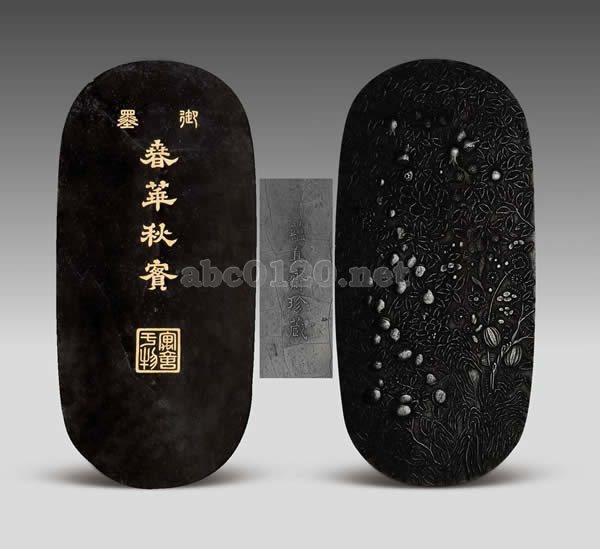 牛舌形〈長楕円)の大形墨である。表に春の花と秋の果実に岩石を配した図である。縁辺にふちどりがなくすっきりした形がこの墨にはピッタリしている。裏に御墨の篆書二字、隷書縦書の「春華秋實」の墨名が填金されている。下に「寓舎于物」の方印を刻している。漆仕上げがしてあり、漆黒色の豪華墨である。