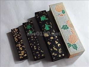 清朝古墨は乾隆御墨以外にも若干の注目されるものがある。 圭形。六センチほどの極小墨。金巻き。曹素功代表墨の一種である。 現代墨に「漱金」があるが、これは大衆墨である。出所:『文房古玩事典』宇野雪村 関連用語: