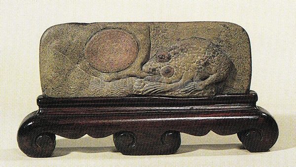 澄泥の色層の差を利用し、彫琢を施して台上に組みこみ硯屏としている。