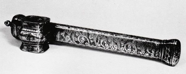 長崎を通じて和蘭との通商を行った。日本では禁止されたキリスト教だったが彼等には信教の自由が許されていたかその人達の注文に応じて作ったのであろう、クルス形(十字架)の矢立がある。刻図は異様でエキゾチックなものである。矢立の国際制示すものとしてに注目される。出所:『文房古玩事典』宇野雪村