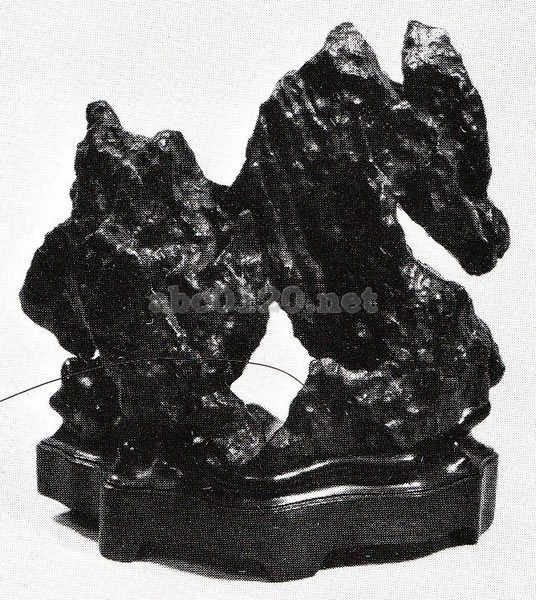 既述の『雲林石譜』には百有余種の中国産の名石が挙げられている。石塊に紫檀の台をつけ、その奇岩怪石ぶりを鑑賞されている。出所:『文房古玩事典』宇野雪村