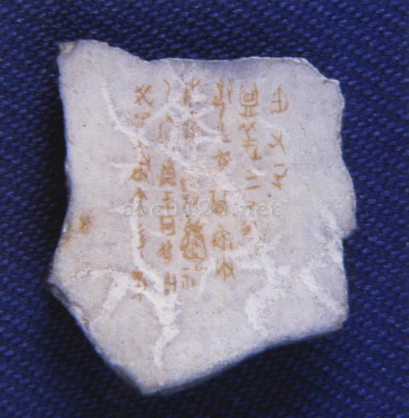 周初の遺物と考えられるト骨である。亀の甲に29文字が刻まれ、その文字は粟粒の如く小さい。四周の人々の占いの辞である。周初の遺物と考えられるト骨である。亀の甲に29文字が刻まれ、その文字は粟粒の如く小さい。四周の人々の占いの辞である。出所:中国陝西省宝鶏市周原文物展