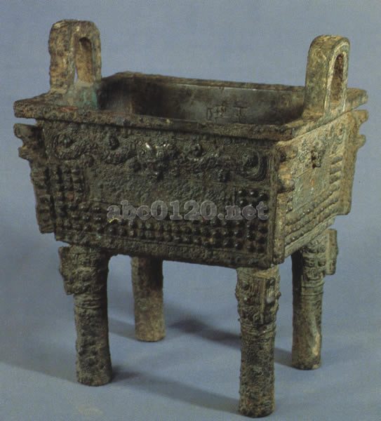 鼎は現代の鍋に相当し、肉を煮るのに用いた。丸い胴に二つの耳と三本の足を持つが、四足の方鼎もある。この鼎は仲姫が作ったもので方形を呈している。器壁は厚く、四隅に稜飾が見られる。各面の腹上部には双身共首の龍紋を飾る。地紋として円渦紋が見られ、腹下部には三列の乳釘紋が見られる。腹部の内壁には六文字の銘文が鋳られている。出所:中国陝西省宝鶏市周原文物展