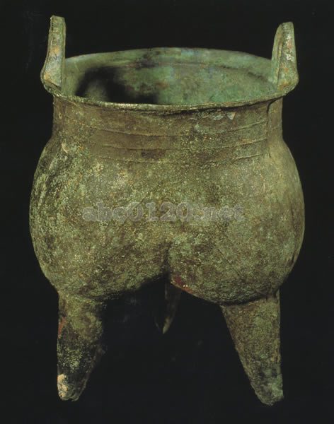 鬲は飯を炊いたものである。三本の足は中空で先は細く尖っている。口縁に耳が縦につき、口は若干すぼまる形をしている。頸部には三股の弦紋を飾り、腹部には断面三角形の凸線による弦紋が見られる。出所:中国陝西省宝鶏市周原文物展