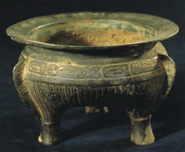この鬲は幅広く平な口唇をもち頸部がくびれている。三本の足をもち、腹部には稜飾が見られる。その両側には太い眉と大きな眼が表わされ、饕餮紋の変形と考えられる。肩部には一段の環帯紋が巡る。出所:中国陝西省宝鶏市周原文物展