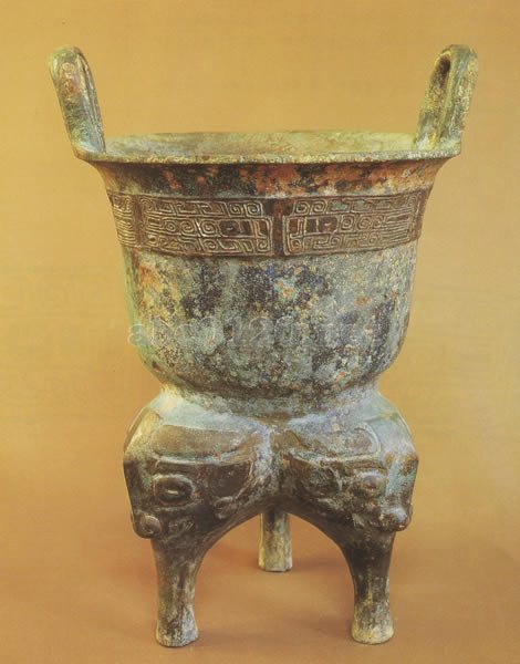 この甗は腹部に饕餮紋を飾り、甑の頸部には簡略化された一段の竊曲紋が巡っている。出所:中国陝西省宝鶏市周原文物展