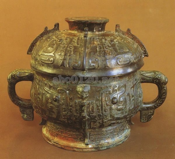 この簋は上腹部に雷紋を地紋として施し、垂冠曲尾の鳳島紋を飾る。腹部はやや下ぶくれで、圈足と蓋に稜飾がある。一対の耳が付きその下に耳飾(珥)を垂している。全体の造形は精巧でかつ雄渾であり、また紋様は複雑で美しく細密である。出所:中国陝西省宝鶏市周原文物展