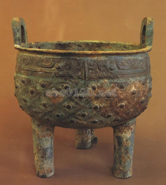 この鼎は丸い腹部と三本足、双耳をもっている。口縁は、雷紋を地紋とし、夔龍文が巡る。腹部には方格乳釘紋を飾る。出所:中国陝西省宝鶏市周原文物展