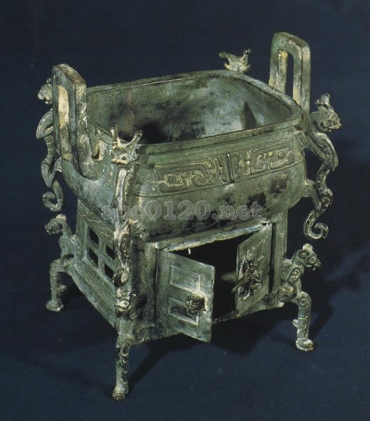 この鬲は方形をし、下部には開閉できる門があり、そこから炭火を入れて食物を温めるようになっている。門に足切り(削剥)された門番の奴隷の姿が飾られていることから名が付いた。四隅には尾を巻いた夔龍がそれぞれ付けられ、口縁下には雷紋を地紋とした竊曲文が見られる。方座は四匹の獣によって支えられ、正面には開閉のできる門があり、側面には窓がある。四隅の獣の眉目は猿に似て鷲のような口嘴をもち、さらに羊のような曲った角をもって全体の形は鹿に似ている。この鬲のデザインは特に凝っており、造形は精巧で美しく、青銅器芸術中の優品といえる。出所:中国陝西省宝鶏市周原文物展