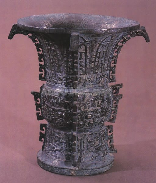 折尊の四面には透彫の稜飾があり、腹部には二匹の夔を左右対称に組合わせた饕餮を飾っている。そして圈足には首長く爪鋭く、長く垂れ下がるとさかをもつ顧首夔龍紋を飾る。頸部には首を上げて対峙する蕉葉鳥紋を飾る。地紋としては雷紋を施し、凹線による雷紋も認められる。それらの紋様は豪華にして華麗であり、細かく念の入った様は尋常ではない。なお、折尊の銘文は折觥と同じである。出所:中国陝西省宝鶏市周原文物展