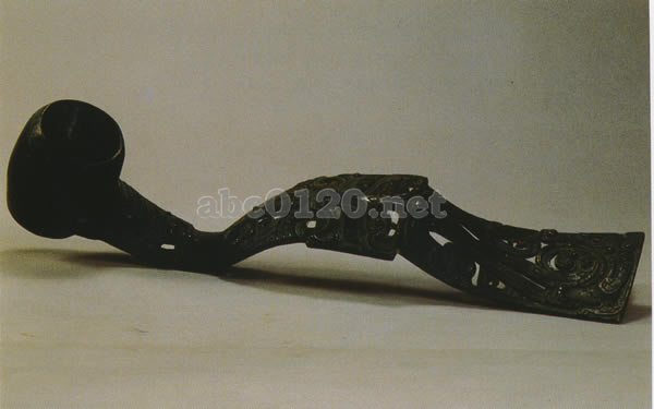 勺とは酒を飲む時、酒器から酒を汲んだものである。酒を汲む部分は円筒形をし、柄は弓形で精密で美しい。柄の先に双鳥双夔が絡みあっている。柄の中程には饕餮紋を飾り、根元には獣面を配している。