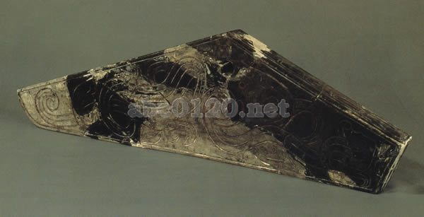 磐は楽器である。祭祀や饗宴の時に使用した。大小を並べて横木に懸ける。磐の大小によって音律が異なり、周時代にすでに五音階がそろっていた。音階は厚みと大きさによって調整した。この磐は召陳村の宮殿跡から発見され、石製で、凹線の夔龍紋が見られる。出所:中国陝西省宝鶏市周原文物展