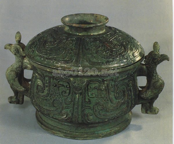この簋はとうが作ったものである。構成は巧妙で、装飾も工夫が凝らされて生き生きとしている。器の両側には丸彫りで頭をあげ、とさかを真直につけた鳳凰形の耳が付く。蓋と身にはとさかを長く垂らし、尾を巻いた長い鳥紋が飾られている。鳳鳥は生き生きと真に迫って対峙している。蓋と器身には134字の同じ銘文が見られる。銘文によれば、とうが部隊を率いて安徴(揚子江下流域)一帯へ駐し、その地方の異民族を征伐した経過が記されている。なお、伯とう草墓からは盉、鼎、爵、觶、壷、戈、殳など18点の青銅器が発見されている。出所:中国陝西省宝鶏市周原文物展