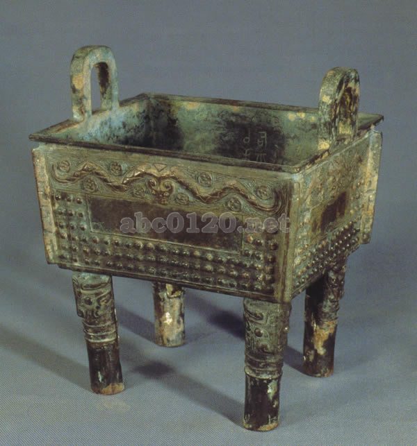 この鼎は方形で耳はアーチ型である。腹部の四隅には稜飾りが有り、口縁下には浮彫りの夔龍座紋を飾る。その形は双身一首で、くねる体の下は円渦紋で埋めつくされている。さらに下には三列の乳釘紋が施され、足には獣面紋を飾る。腹底には「姤姒康」の三文字が見られ、姒母康の鼎であることを示している。出所:中国陝西省宝鶏市周原文物展