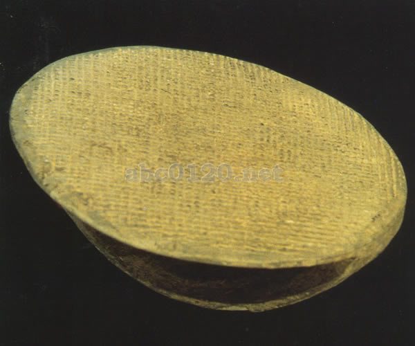 陶(爽+瓦)は穀物をこの上で揉んでモミ殼を取り去る道具である。この(爽+瓦)は泥を焼いて作られており、灰色である。表面には格子状の凹線が刻まれている。アーチ形の把手は吊り下げるのに便利である。出所:中国陝西省宝鶏市周原文物展