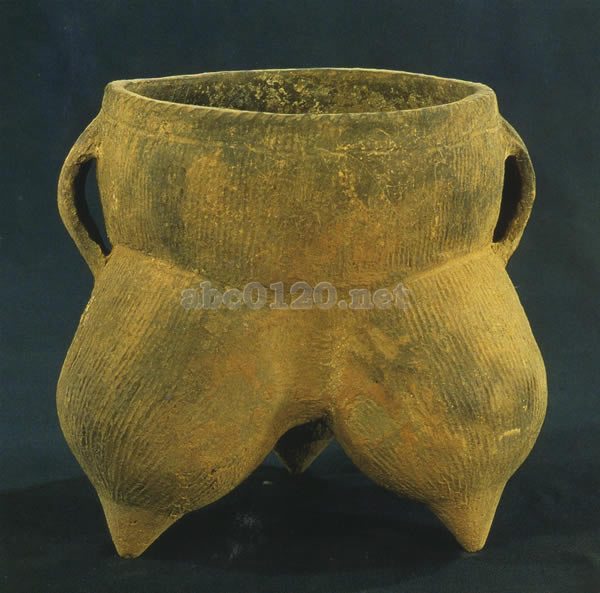 この陶鬲は劉家村の姜戌墓より発見された。姜戌は周族と同時代に宝鶏一帯で活躍した一部族である。文化的様相は周人とは異っていた。この鬲は紅褐陶であり、陶泥中に更に陶を混ぜ合わせている。口はすぼまり、耳は大きく、中空の大きな足をもつ。腹部には縫紋が施紋されている。出所:中国陝西省宝鶏市周原文物展