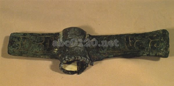 この斧は荘白村の伯とう墓から出土した。全体に鱗紋を飾る青銅製の武器である。斧の銎(柄を差しこむ孔)は楕円形の円筒状をなす。端には雲紋を飾る。なで切ったり、ひっかけたり、叩きおろしたりして用いる。また、儀仗の際にも用いる。出所:中国陝西省宝鶏市周原文物展