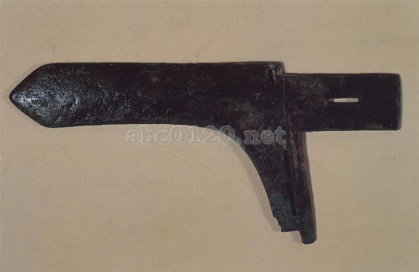 西周時代 全長12.3cm・胡長12cm・内長5.5cm・重量500g 陝西省扶風県城関下河出土(1981年) 扶風県博物館蔵 戈は古代の銅製武器の一種。ひっかけて斬り殺すのに用いた。この戈の胡には二つの孔があり、援は狭まくて長い。刀身には脊が突起し、刃は鋭い。出所:中国陝西省宝鶏市周原文物展 関連用語: