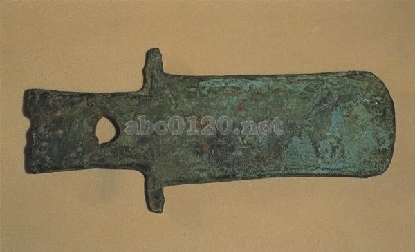 西周時代 全高16.2cm・幅4.3cm・重量250g 陝西省扶風県上宋北品村出土(1978年) 扶風県博物館蔵 鉞は古代の兵器あるいは刑具である。 この鉞は精美な作りで、儀仗に用いられたものと思われる。出所:中国陝西省宝鶏市周原文物展 関連用語: