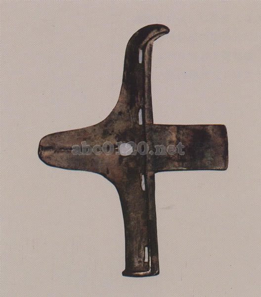 戟は戈と矛が合体した複合武器である。戈のひっかける機能と矛の剌す機能を兼ねている。この戟は戈の援の部分が短く幅も狭い。舌状を呈し、脊が見られる。胡は長く孔があけられている。上胡の先端も蛮曲して刀となっており、比較的進んだ武器と言える。出所:中国陝西省宝鶏市周原文物展