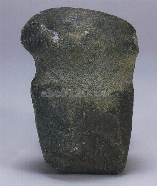 原始社会で用いられた打製の道具である。この石器は、当時の人々が厳しい環境のなかで木を切り、家をつくり、木材を割るために用いた道具である。粗末なものではあったが、当時の生産に重要な役割を果した。出所:中国陝西省文物展悠久の遺産1987