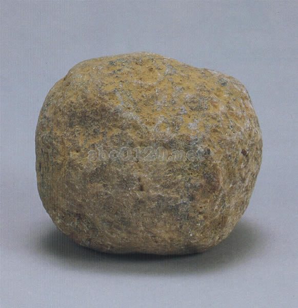 旧石器時代 直径8cm 重0.52kg 1980年陝西省洛南県河口出土 西安半坡博物館蔵 民族学の研究によれば、古代人が飛石索に使う狩猟用の石弾である。この種の投てき用の石球を使うと、狩猟の効率があがり、大きな動物を狩猟することができる。出所:中国陝西省文物展悠久の遺産1987 関連用語: