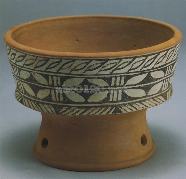 陶(皀+殳)は食物を盛る容器である。この(皀+殳)は、口が大きく、脚部は円形てへ脚部下辺に3つの孔がある。皿の腹部外周は二方連続文で飾られ、装飾は美しく、造形も自然である。出所:中国陝西省文物展悠久の遺産1987