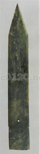 玉圭は四周貴族が朝覲と祭祀の時に用いた禮器である。諸侯が王に拝謁するにあたって圭を執り示した。この圭は長形で、一端が尖っている。両面とも無紋で両縁に刃がつく。内(圭の柄)には円孔があり、青玉製で、製作は精細である。出所:中国陝西省文物展悠久の遺産1987