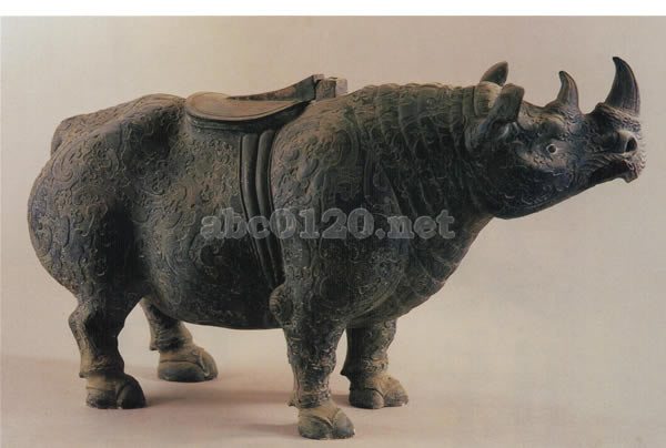 この犀尊は動物の姿を表現した酒器である。動物の造形は写実的で、犀の力強さと壮健な体格の特徴がうまく表現されている。全身にあざやかな金銀象嵌の流雲文が施され、金の糸が点々とつながり、本物の犀毛のように巧みにつくられている。背中には蓋が付き、開閉もできる。犀口の部分には管状の短流がつけられ、中の液体を注ぐことができる。中国の青銅工芸技術が当時高度に発展していたことが知られる。出所:中国陝西省文物展悠久の遺産1987