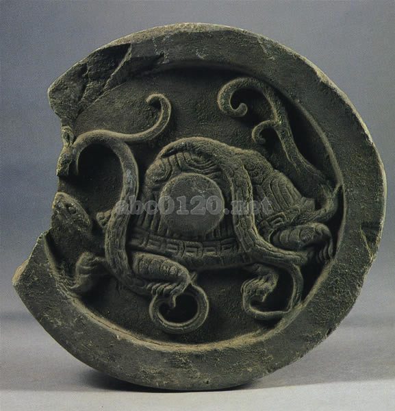 玄武は四神の中で北方を代表し、その形は亀と蛇の合体したものである。玄武は北方神で、火を消す能力があると考えられ、特別な待 遇を受けた。後世は、尊んで玄元大聖として、廟を建てて祀り、火災を消滅させ衆生を守護してくれることを願った。玄武の瓦当は建造物の北側によく用いられている。出所:中国陝西省文物展悠久の遺産1987