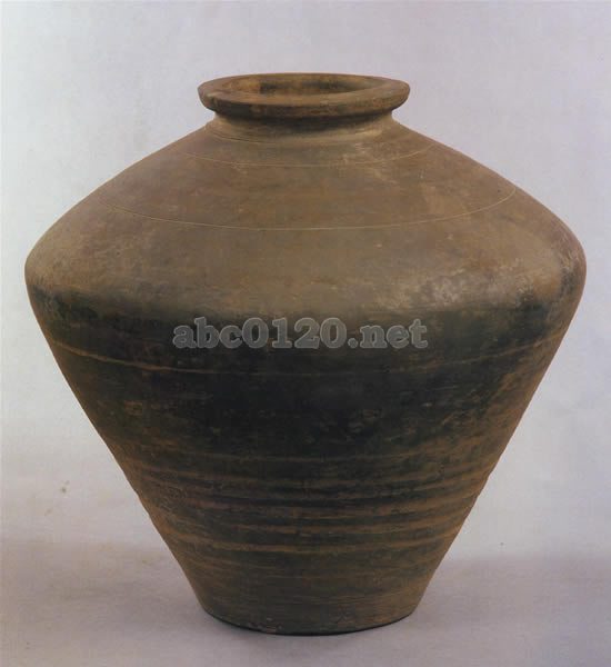 漢時代の陶器は大部分のものに装飾があって、芸術手法も豊富多彩である。装飾には、水平周回文・縄文・圧印文などがあり、また彩色・彩絵の手法もある。陶器が高度に発展した段階である。この陶罐は灰色で、口部と底部がやや小さく、腹部が大きい。装飾は簡素で、腹部に院線周回文が施されている。出所:中国陝西省文物展悠久の遺産1987