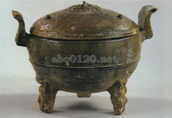 東漢(後漢)時代 高さ180cm 口径1.55cm 腹囲64cm 重さ2.3kg 1979年西安市南郊孟村出土 陝西省博物館蔵 この鼎は、口が小さく、胴部は深い。両側に耳がつき、3本の獣足があり、有蓋である。器全体に黄釉が施されている。出所:中国陝西省文物展悠久の遺産1987 関連用語: