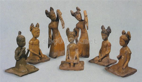 この1組の楽舞俑群は7人からなっている。彼女らの5人は楽女で、それぞれ楽器を手にして囲むように坐り、中央の2人は舞女で、軽やかに長袖をひるがえし、ゆらゆらと舞い踊る。なお、あどけなさの残る顔だちと、繊細な頸や腕からみると、いずれも20歳をこえない少女であると思われる。出所:中国陝西省文物展悠久の遺産1987