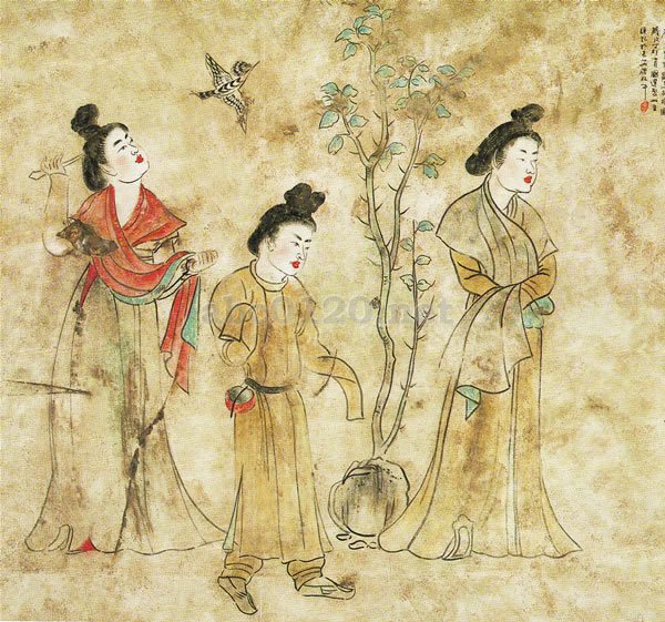 この壁画には、3人の宮女が描かれており、左の人物は高髻で、上半身に細袖の衫を着て、その上に肩掛をはおり、下半身に長裳をはき、飛ぶ鳥を仰ぐ姿勢と思われる。中央の人物は双髻で、男装し、身に丸首の長袖を着て、脚に先の尖ったくつをはき、全神経を集中させて、樹の幹にとまって鳴いている蝉を捕えようとしている。右に立つ人は両手を胸前で組み、黙々として何か思いにふけるかのようである。これらの宮女はいままさに女ざかりで、後宮内にとじこめられた寂しい境遇と空虚な心情がにじみ出ている。出所:中国陝西省文物展悠久の遺産1987