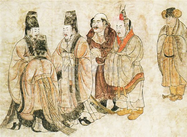 この壁画の左側に立つ3人は唐の鴻臚寺の役人で、その袍衣が朱色であることから、四・五品の官であると推定される。4番目の人物は丸顔、禿げ頭、濃い眉、深目高鼻で『旧唐書・拂菻(東ローマ帝国)伝』によって推測すると、東ローマ帝国の使節かもしれない。5番目の人は頭に羽毛の帽子をかぶり、直立する2本の烏の羽をつけ、身体には長袍を着て、腰に帯を束ね、黄色靴をはいている。『旧唐書』の日本・高麗に関する記載によれば、日本あるいは高麗の使節かも知れない。6番目の人は毛皮の帽子をかぶり、丸首の灰色の外套をはおり、毛皮のズボンをはいているが、『旧唐書』の室韋・靺鞨(ともに中国東北部の民族とくに渤海国と呼ばれる)に関する記載によれば、この人は中国の東北の少数民族の代表かもしれない。この壁画は、当時の中国と外国および国内各民族の間の交流の史実を記録し、唐代の中国と外国の友好往来を研究する上で珍しい貴重な資料である。出所:中国陝西省文物展悠久の遺産1987