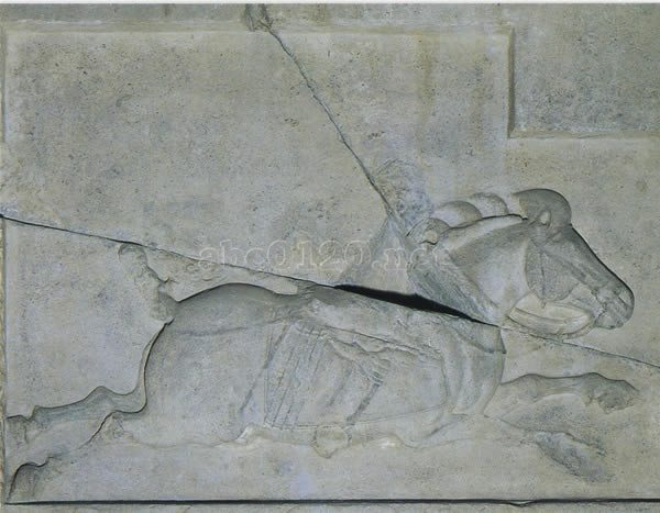青騅は白色の毛をした馬(ネズミゲ)であり、李世民が、賓建徳と虎牢関において戦った時乗っていた馬である。この馬は、身体の前に1本、後に4本、計5本の矢が突き剌さっている。作者は簡潔な手法と明確な造形で、天空高く飛翔し、突撃して敵陣を陥す馬の雄姿を表わしている。出所:中国陝西省文物展悠久の遺産1987