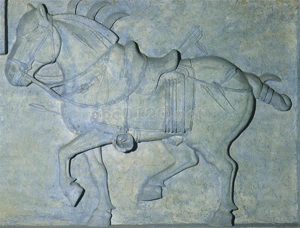 この馬は、毛色は黄色く、口のまわりが黒い馬(カゲ)である。紀元622年、李世民が劉黒達と洛川において激しく戦った時に乗っていた馬である。馬が9本の矢に突き刺されて死んでしまったことから、李世民の苦戦のほどがしのばれる。出所:中国陝西省文物展悠久の遺産1987