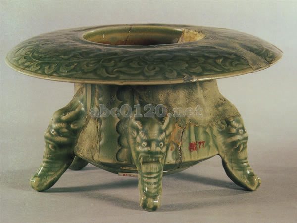 この炉は直口で、平らで広い口辺部があり、口縁がやや下方に巻きこむ。腹部下半に5足を取り付けている。口辺には牡丹唐草文が刻まれ、炉身の外壁は曲条弧形文で飾られている。足が龍の頭と爪の形になっており、青龍の顔の表現は熟達している、青色の釉をほどこし、釉と文様が調和するようにしている。内壁には、釉を施さず、胎上は灰色で、質が細かい。出所:中国陝西省文物展悠久の遺産1987