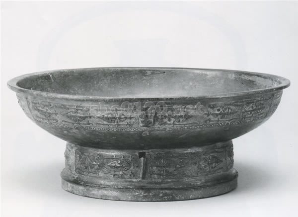 盤としては、比較的内深があり、また圈足が高く、古い様式である。口縁下と圈足とに各一帯の写実的な蝉紋があり、鋳造技法は精巧で、鋳上りがよい。中央の工人の作であろう。かつ、地金は、錫の含有量が多く、器全休に銹蝕がなく、その点は四周初期の洛陽工房鋳製品と共通性がある。周初の凌源出土青銅器を代表する優品のひとつである。出所:中国の器展ー青銅と陶器