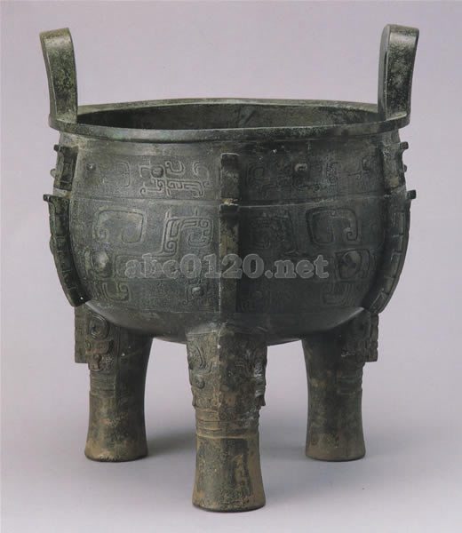 太い三足の上に堂々とした重量感あふれる器体をのせたこの鼎は、殷代後期の典型的な様式といえる。口縁下に一帯の夔龍紋を配し、その下の器腹中央に典型的な饕餮紋を鋳出している。「饕餮」紋とは、空想上の怪獣面を、古典中の名称に基いて宋代の学者が命名したもので、殷周時代に何と呼ばれていたかは不明である。研究者によっては、青銅器鋳造上で必要になる中央線の脊稜を中心に相対する一対の夔龍紋が、次第に怪獣面に変化したものだろう、とも考えている。殷代中期から西周中期にかけての青銅器でもっとも中心的な紋様として用いられている。文中の゛凩″は、文字とは区別されるのでこれを図象銘と呼ぶ場合もあり、その性格に関する解釈からこの青銅器を製作した氏族のマーク(族記号)だとする説が一般的ではあるが、その説では、説明しきれない現象も少なくなく、今後の研究課題である。殷人は、歿後、十干名(甲乙丙…)によって諡り名がつけられた。゛父辛″は、そういった諡り名である。出所:中国の器展ー青銅と陶器