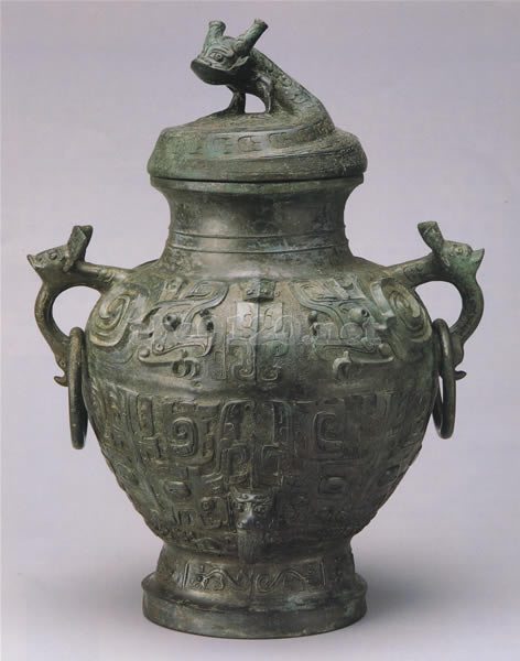 かつ、注目すべきことは、極めて類似した作柄の罍が、遠く直線距離でも二千粁を距てた四川省彭県から発見されている点である。(王家裕「記四川彭県竹瓦街出土的銅器」文物1961年11期八)。このことは、中央の同一鋳造工房において同時期に作られた2器が、遠く1器は東北の遼寧に、1器は西南の四川に運ばれたことを暗示している。両器に共通して見られる特異な獣頭渦身紋は、西周初期の洛陽で作られた器に多く見られる。出所:中国の器展ー青銅と陶器
