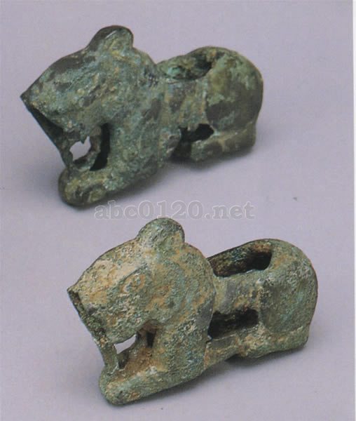 小虎は7件が発見され、これらはいずれも同范で鋳造されたものである。小さな虎が地に伏せ、目は前方を見、尾を横に巻き、ロは開いて筒のようになっている。背の一方は穴が開いていて腹の底と通じている。尾に圜孔ひとつがある。筒口・尾ロ・背腹の穴はいずれも帯にはめて用いるためのものである。出所:中国の器展ー青銅と陶器